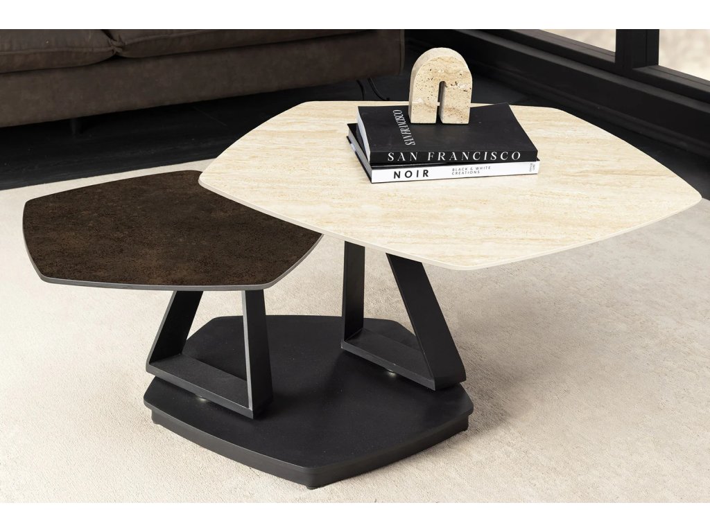 Dominantou stolku jsou dvě keramické desky s úžasnou kresbou mramoru nebo přírodního kamene (dle zvolené varianty). Díky unikátnímu rotačnímu mechanismu se desky mohou nezávisle otáčet, což vám umožní měnit tvar a velikost stolku podle aktuální nálady, počtu hostů nebo uspořádání místnosti.