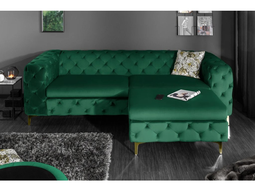 Ponořte se do úžasné směsice klasického chesterfield šarmu a hluboké, smaragdově sametové elegance. Tato exkluzivní pohovka vás okamžitě zaujme luxusním čalouněním z prémiového sametu, které je nejen mimořádně příjemné na dotek, ale dodává prostoru punc sofistikovanosti.