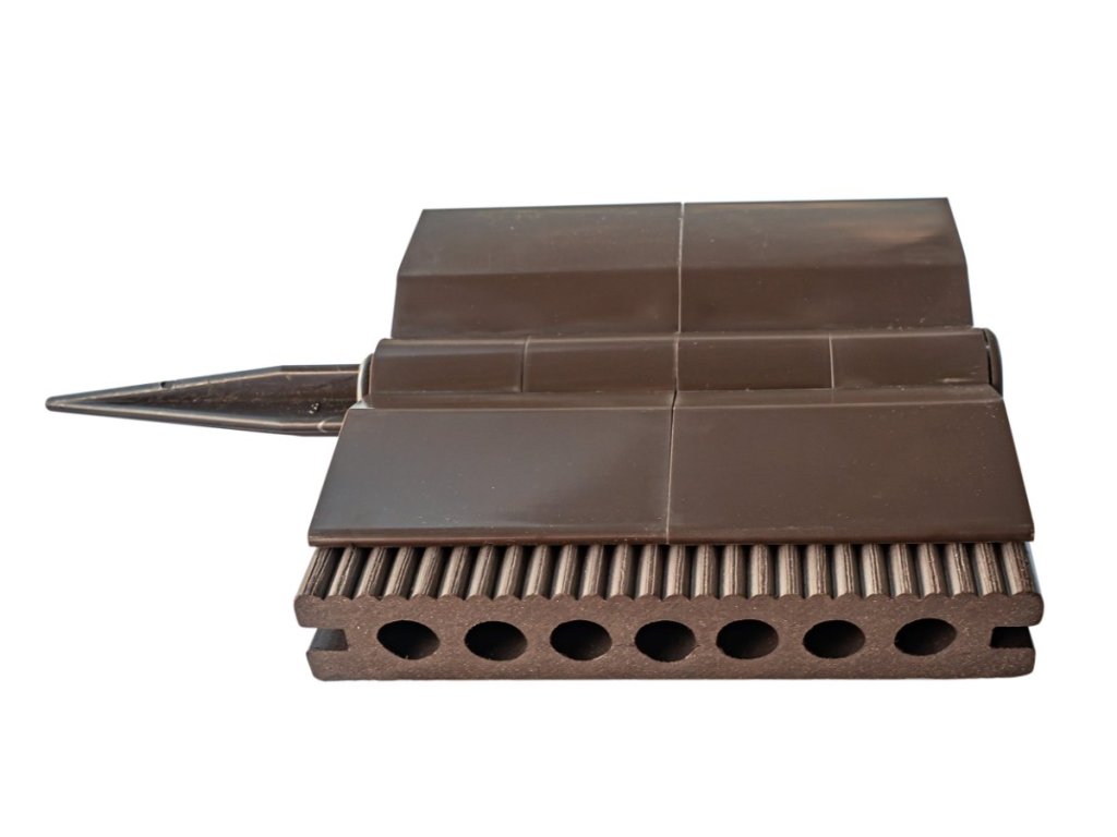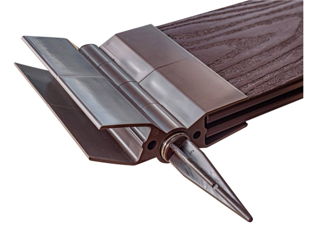 Terasové prkno stačí do rohového prvku jen zasunout - zobáčky prkno drží bez dalšího kotvení nebo šroubování.