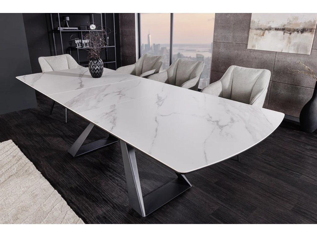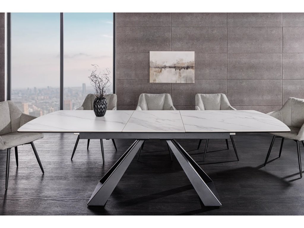 Dodejte své jídelně nádech exkluzivity s rozkládacím stolem CONCORD. Tento kousek v sobě mistrně spojuje úchvatný mramorový efekt s prvotřídními materiály – robustní keramikou a tvrzeným sklem. Výsledkem je povrch, který nejen vypadá luxusně, ale vyniká i svou mimořádnou odolností a dlouhou životností.