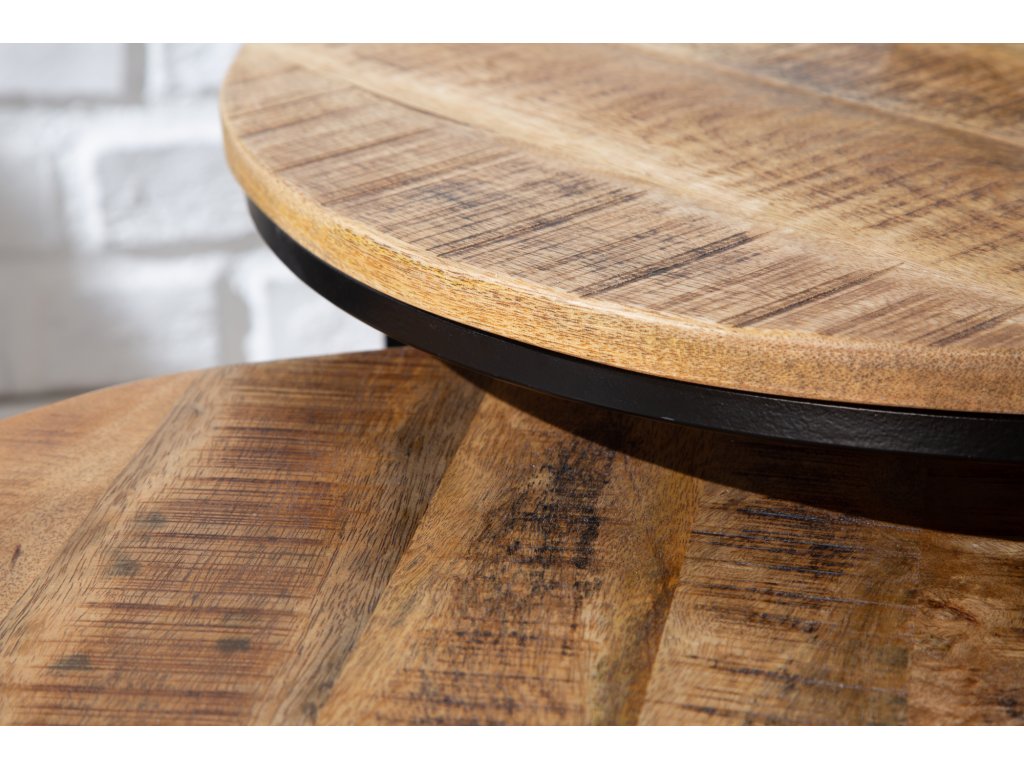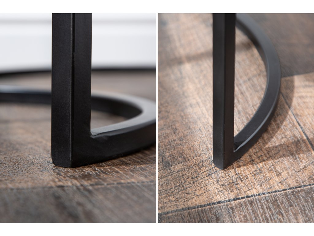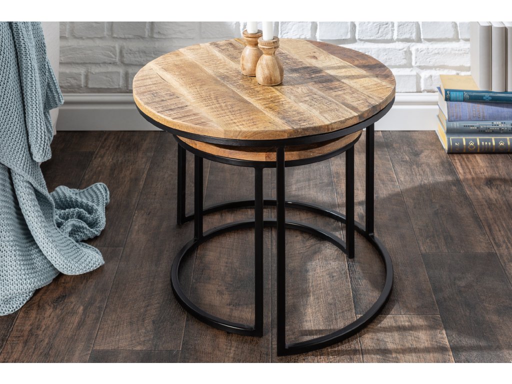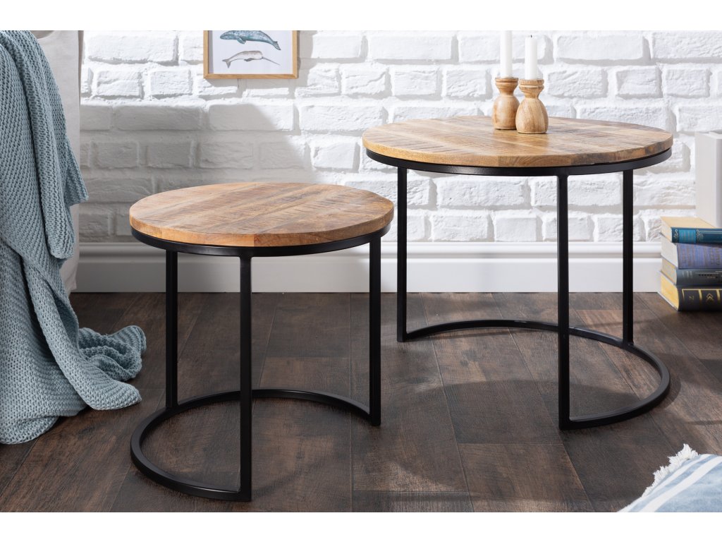 Černý kovový rám s deskou z masivního dřeva. Stolky lze zasunout do sebe.