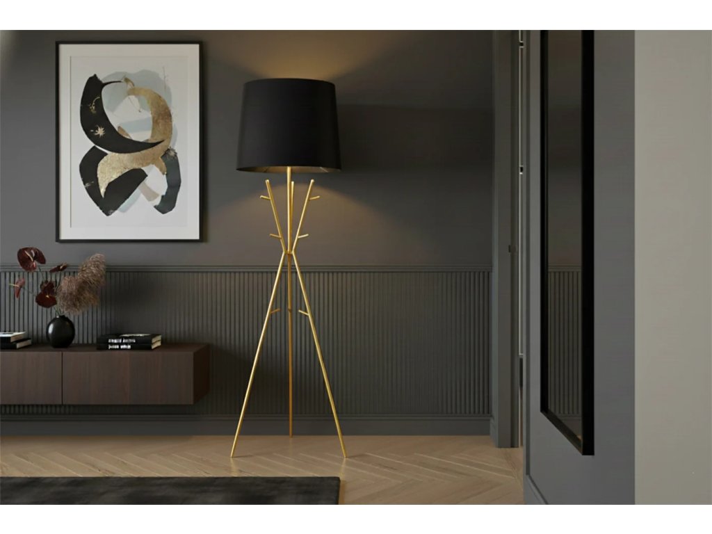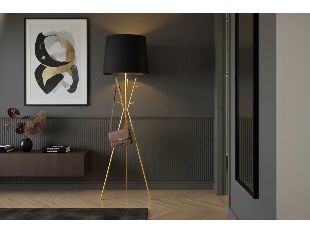 Dominantou lampy je sofistikované černé textilní stínidlo, které doplňuje elegantní věšák v barvě zlata. Tato kombinace vytváří vizuálně silný charakter, který okamžitě pozvedne úroveň moderních předsíní, obývacích pokojů, ložnic i šaten. Díky robustnímu kovovému rámu a vysoce kvalitnímu zpracování získáváte nejen stylový doplněk, ale i odolný prvek interiéru s vysokou stabilitou.